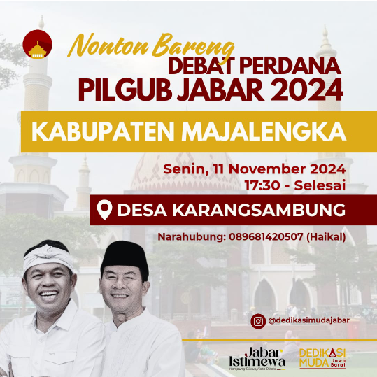 Masyarakat Kabupaten Majalengka antusias menyambut gelaran acara Nonton Bareng debat perdana Pilgub Jawa Barat 2024 yang akan diadakan pada Senin, 11 November 2024. Acara ini akan berlangsung di Desa Karangsambung, mulai pukul 17.30 WIB hingga selesai.