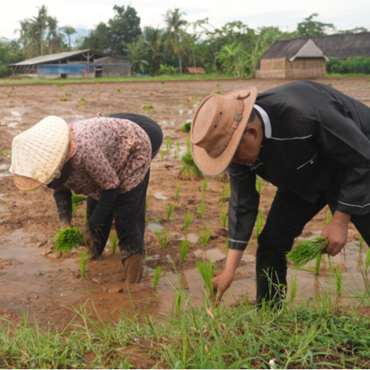 Ia melakukan penanaman bersama belasan warga. Dengan mengenakan pakaian serba hitam dan topi laken, KDM turun langsung menancapkan benih padi ke areal sawah.